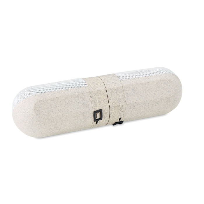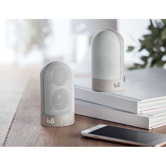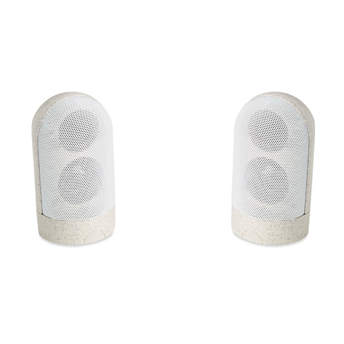 Set de 2 boxe magnetice, wireless 5.0, din fibre de pai de grâu 305 și ABS 70%. TWS cu auto pairing, astfel cele două boxe redau muzica în același timp. O baterie reâncărcabilă de litiu de 300 mAh inclus.. Ieșire: 3W, 4 Ohm și 5V. Timp de funcționare de aproximativ 3 ore.